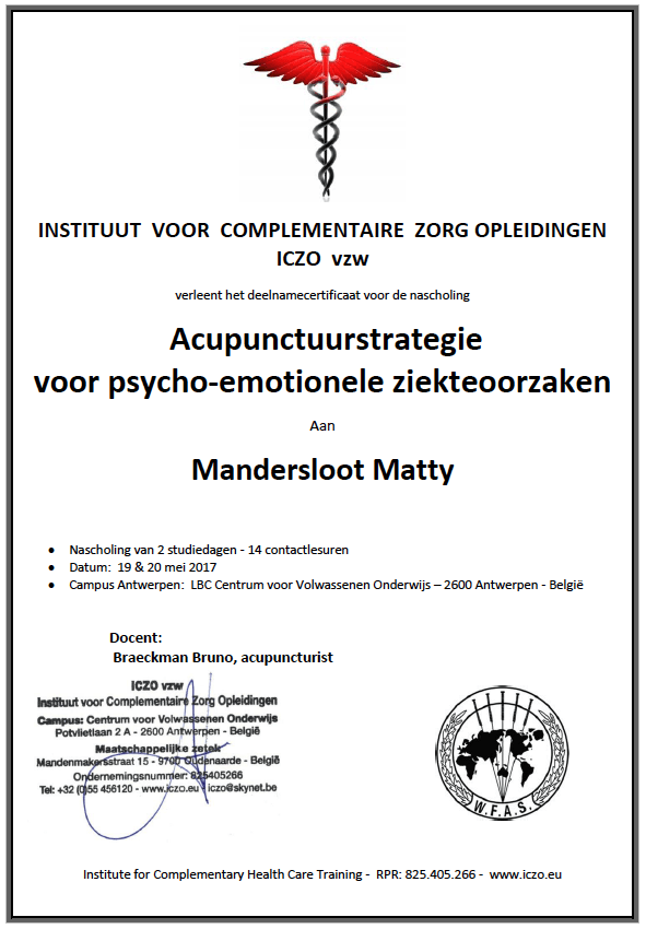 Omdat Matty Mandersloot ook Westers Medisch heeft gestudeerd en is aangesloten bij de vakvereniging Zhong, de RBCZ en WkkGz-proof (klachtencommissie) worden de kosten van een consult bij OostWestWelzijn door alle verzekeraars gedekt, maar niet allemaal op dezelfde manier. Soms heeft je verzekeraar een maximaal bedrag per jaar, per dag of per consult vastgesteld. Raadpleeg hiervoor je eigen verzekering.